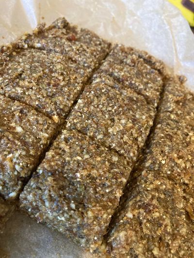 Press into a tin lined with parchment paper and place in the freezer, when frozen cut into bars and store in fridge or freezer.